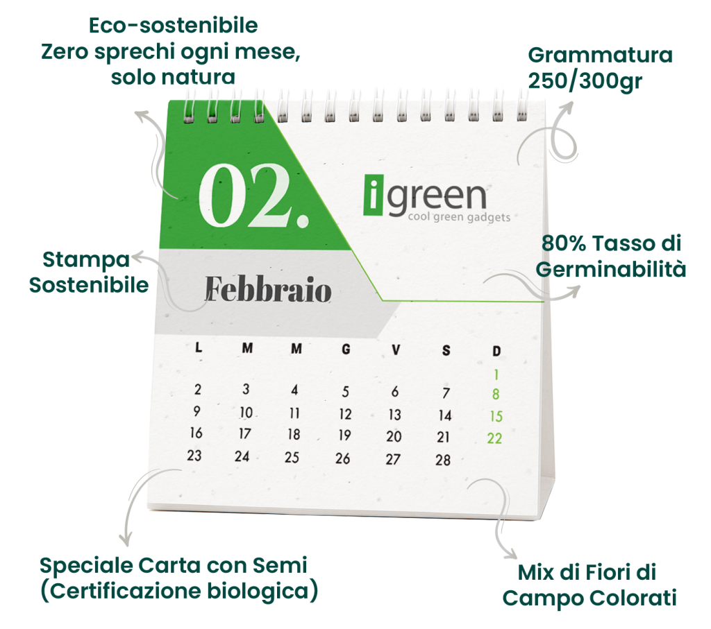Regala ai clienti il Calendario Piantabile. Cosa c’è di più efficace per promuovere il tuo brand? Bello, utile, sempre in vista ed eco friendly. Ogni sua pagina è piantabile, il che genera coinvolgimento ed entusiasmo.