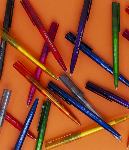 Cosa significa questo? Che il PET riciclato può a sua volta provenire dal riutilizzo di PET riciclato, cioè già sottoposto in precedenza al medesimo processo. Ed è proprio ciò che accade con le penne AQUA, che provengono da PET riciclato post consumo, e che sono a loro volta al 100% riciclabili ancora (e ancora, e ancora…). Insomma, delle penne decisamente… circolari!