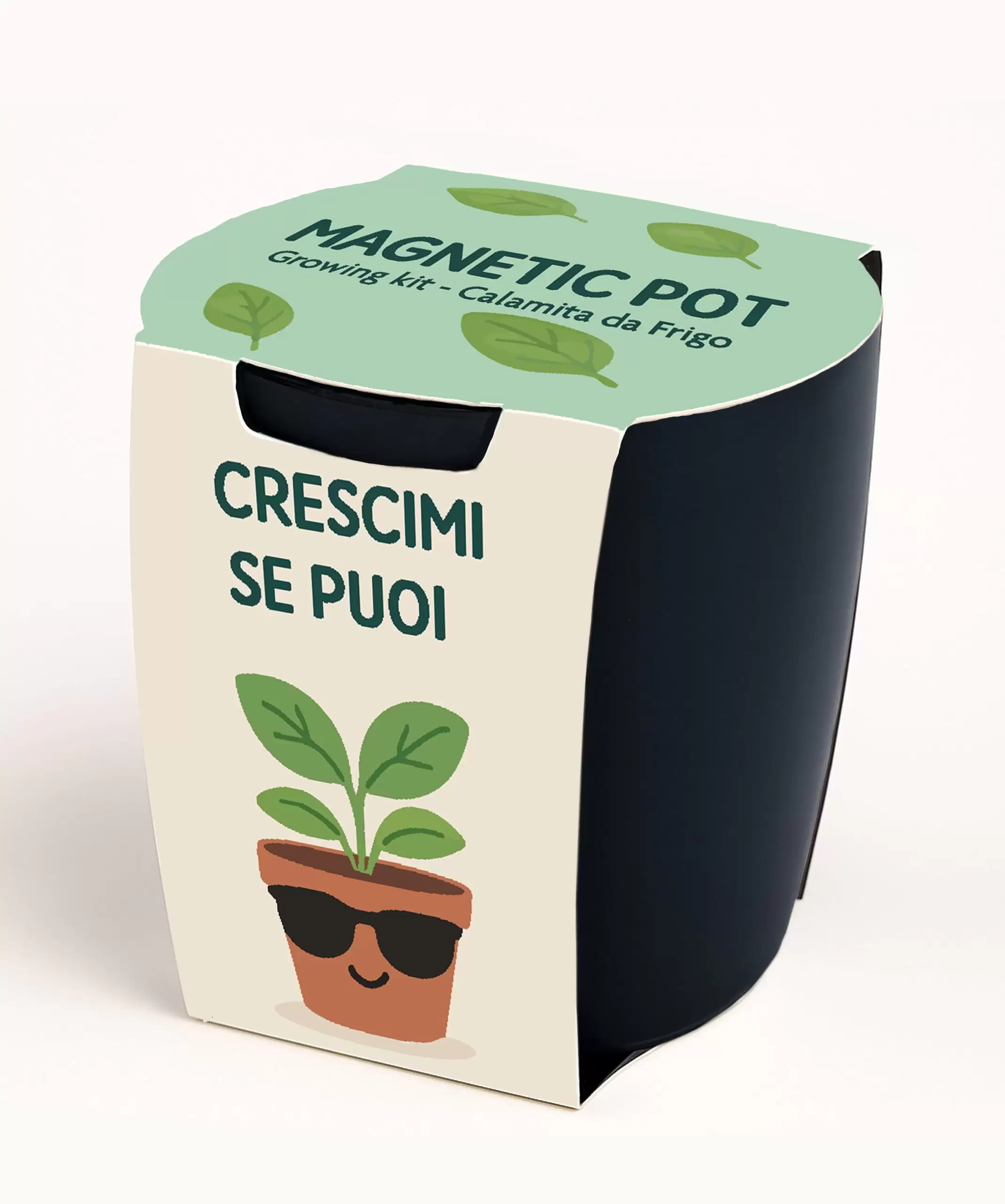 Calamite da frigo iGreen. Mini Kit di coltivazione: vasetto magnetico, bustina di semi e dischetto di terriccio in fibra naturale. Acquistali in versione Standard, oppure in versione Personalizzata.