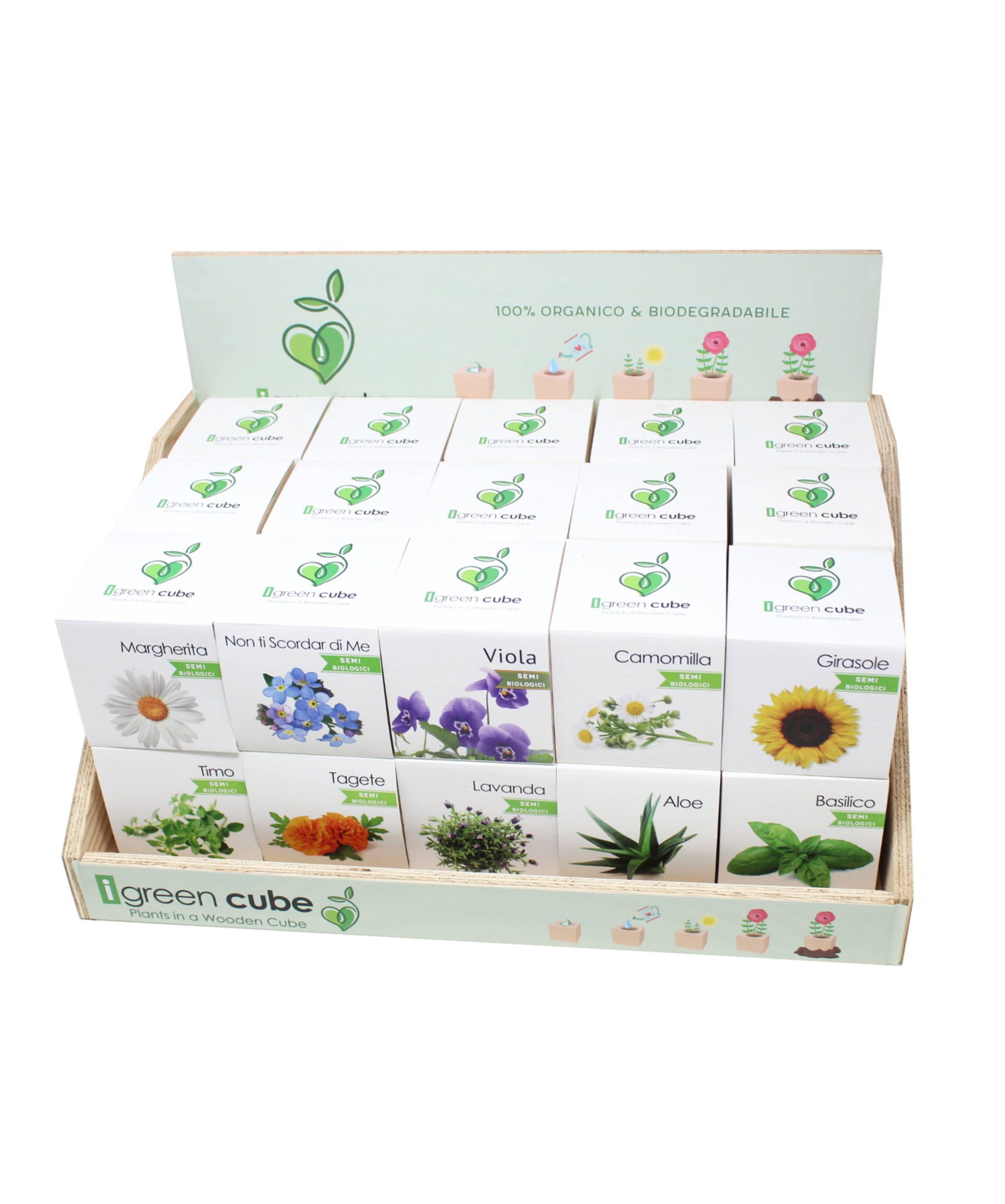 Scegli il tuo display da banco per ricevere l’elegante box con ben 30 cubi differenti per accontentare le esigenze di ognuno. In questo modo, oltre a proporre un oggetto sostenibile e di design, offrirai a grandi e piccini il divertimento di cercare e scegliere tra diverse varietà di fiori e piante. Ogni display da banco per iGreen Cube contiene semi di erbe aromatiche, quali basilico, rosmarino, origano, menta e prezzemolo, mentre se preferisci i fiori, lavanda, non ti scordar di me, e molti altri, sono pronti per essere portati a casa tua.
