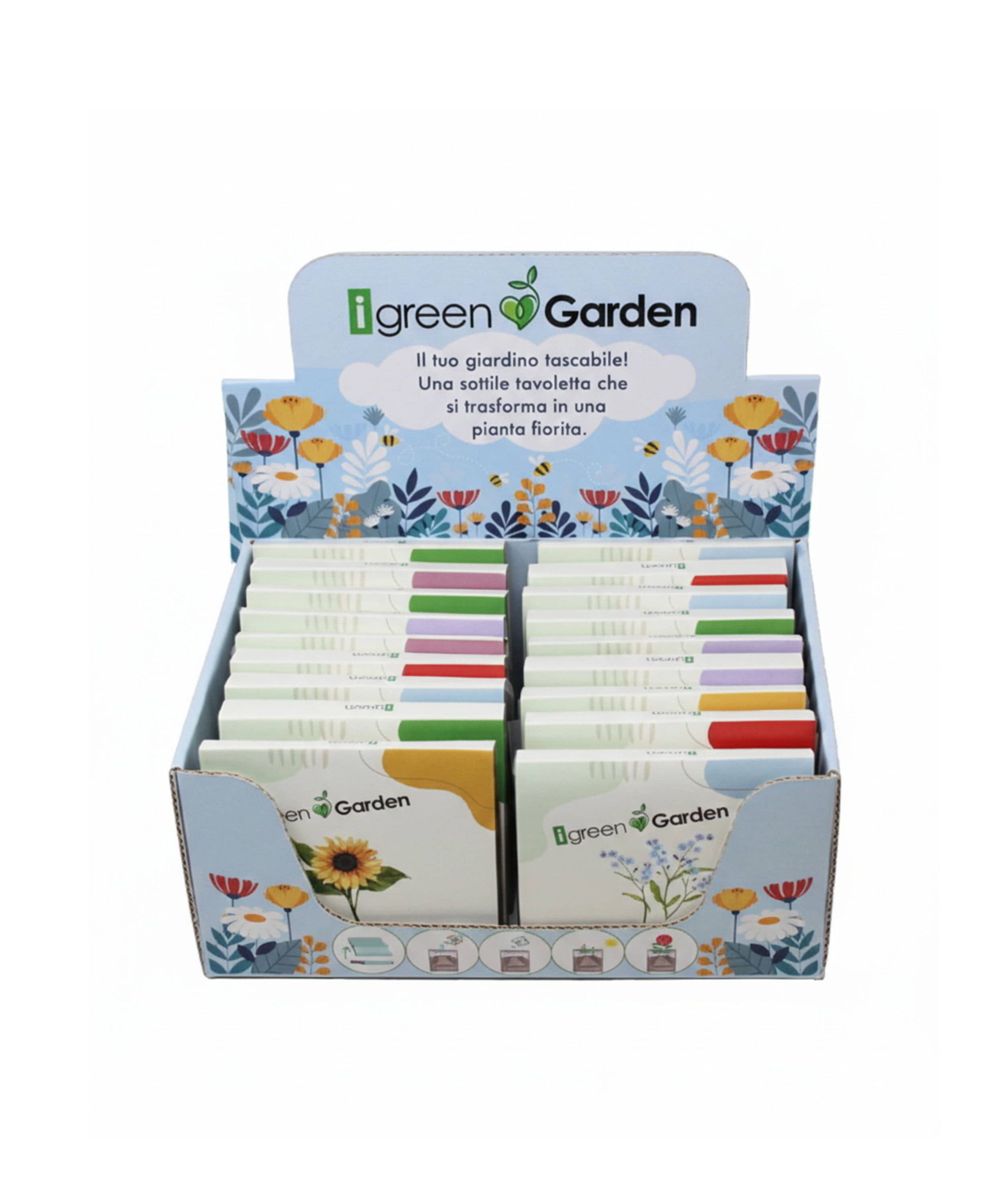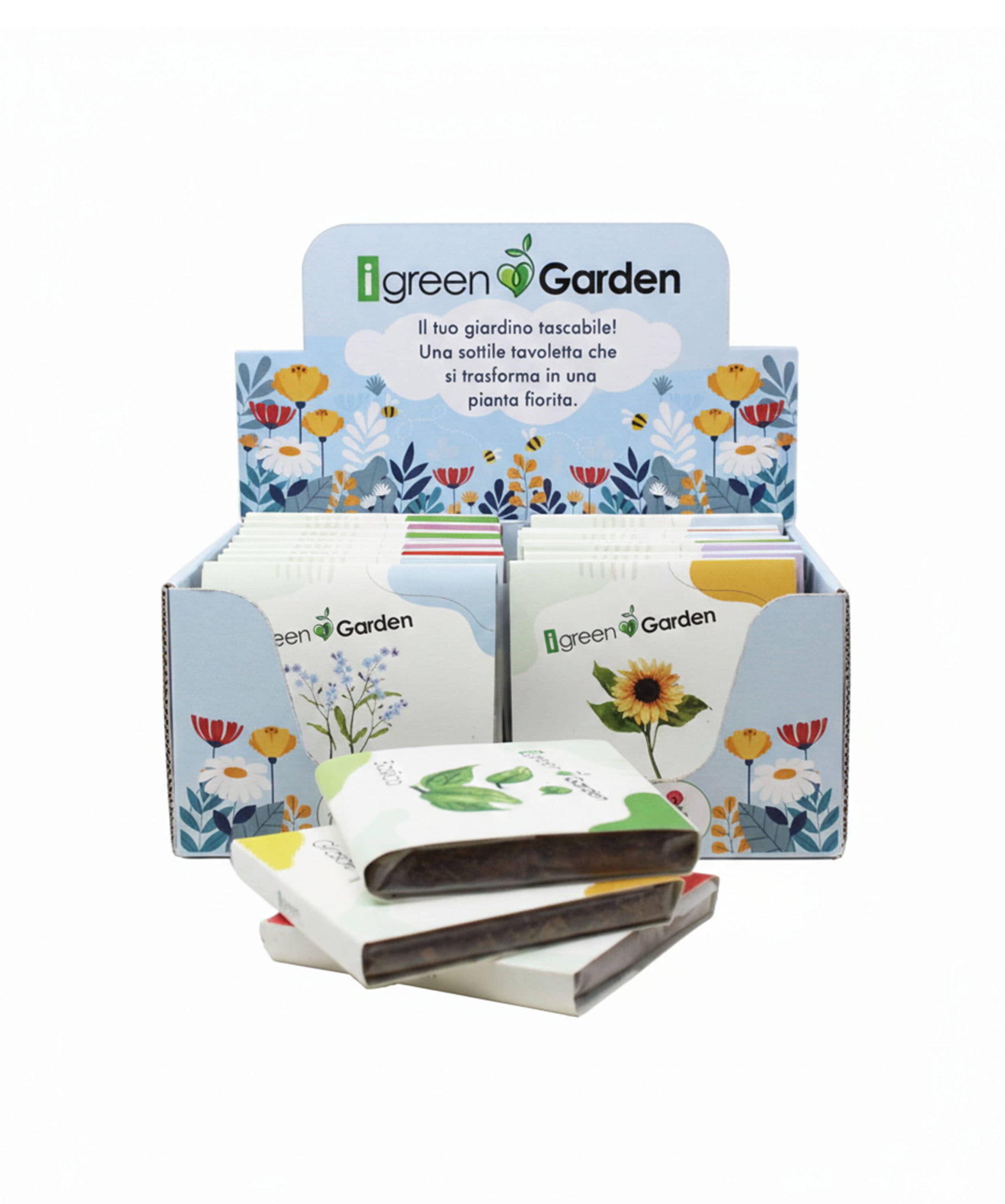 Gli Instant Garden sono l’innovazione che porta la natura a portata di mano. Una sottile tavoletta in fibra di cocco pressato che si trasforma magicamente in una pianta rigogliosa, ideale per decorare spazi ridotti in casa o ufficio. Il tutto racchiuso da una bustina biodegradabile contenente i semi della pianta scelta. Con un imballaggio completamente ecologico e personalizzabile, il Display è la soluzione perfetta per colorare il tuo negozio. Scegli tra le 6 varietà di fiori e piante aromatiche per creare il tuo angolo di paradiso personale.