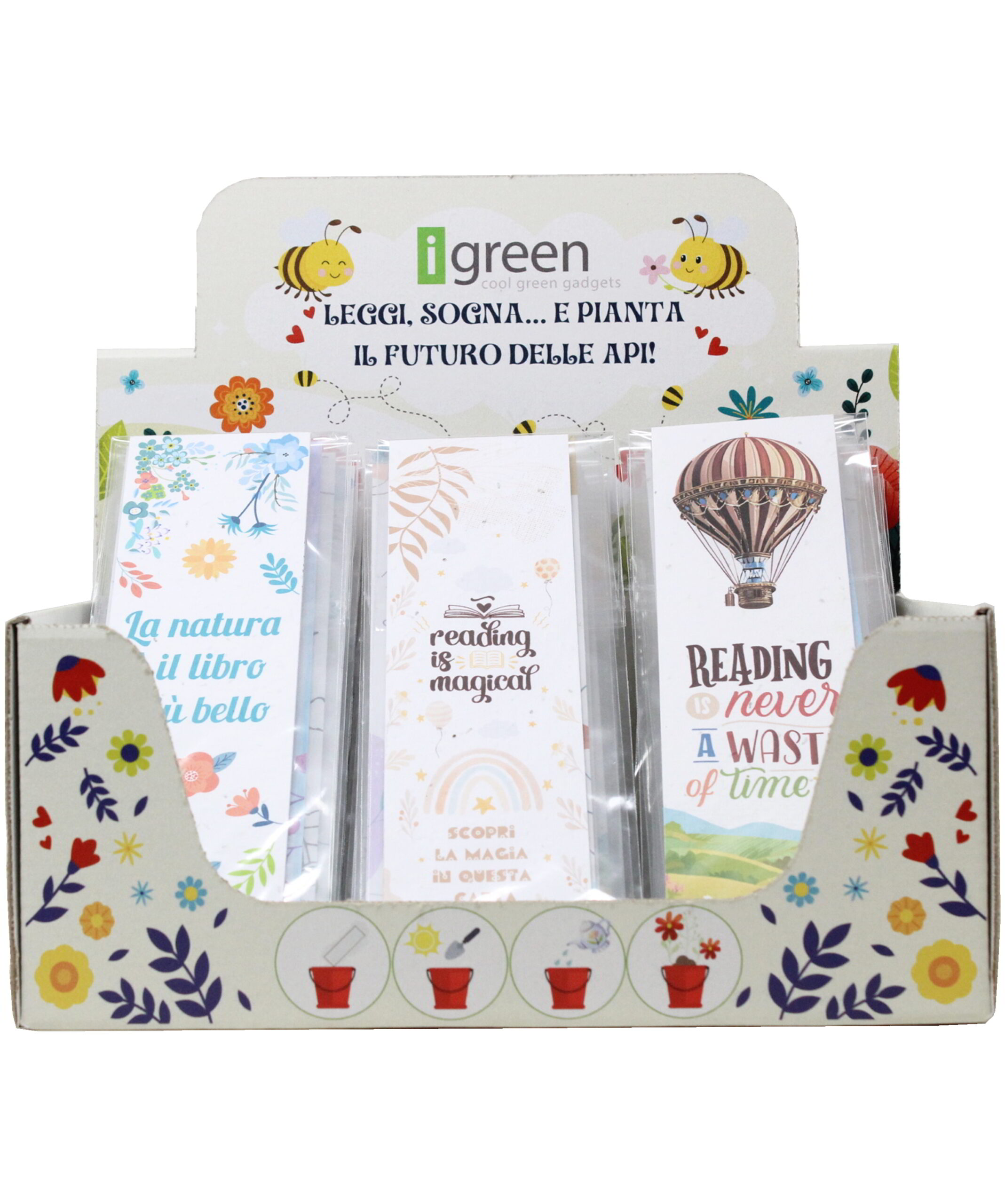 Il pratico display in cartone riciclato è studiato per catturare l’attenzione in cassa o sugli espositori. Le grafiche curate, i messaggi ispirazionali e la varietà di soggetti rendono il Segnalibro Piantabile con Semi irresistibile per chi cerca un pensiero veloce, economico e sostenibile. Perfetto per punti vendita, corner green o eventi, è studiato per esporre il prodotto con eleganza e semplicità, rendendolo immediatamente riconoscibile.